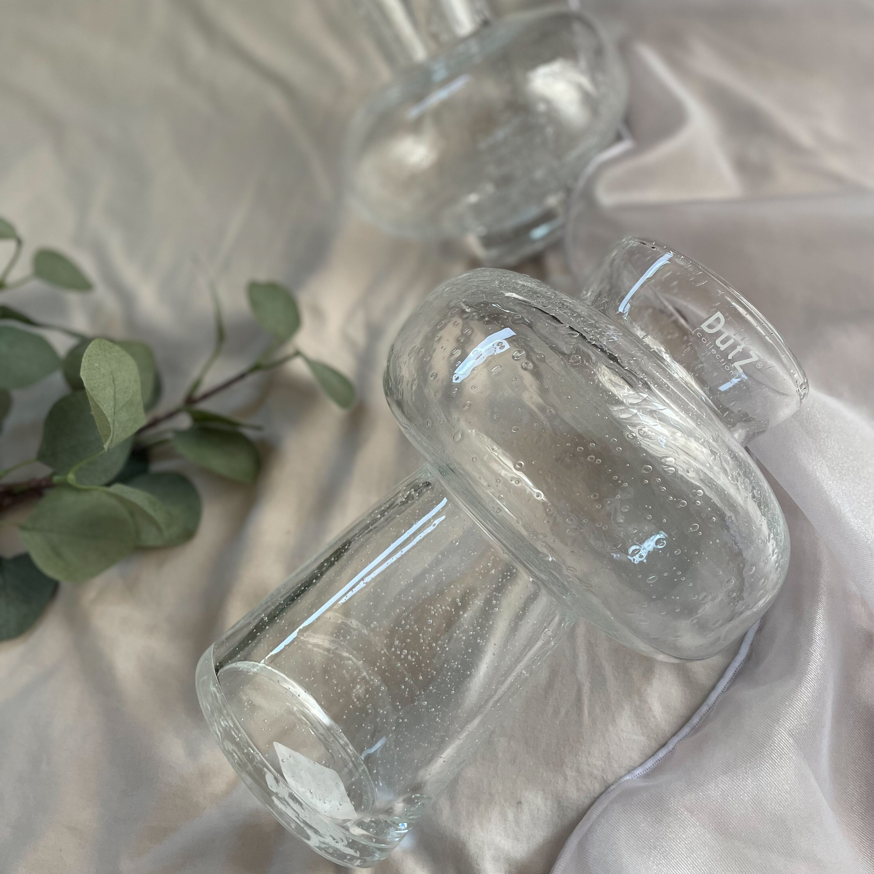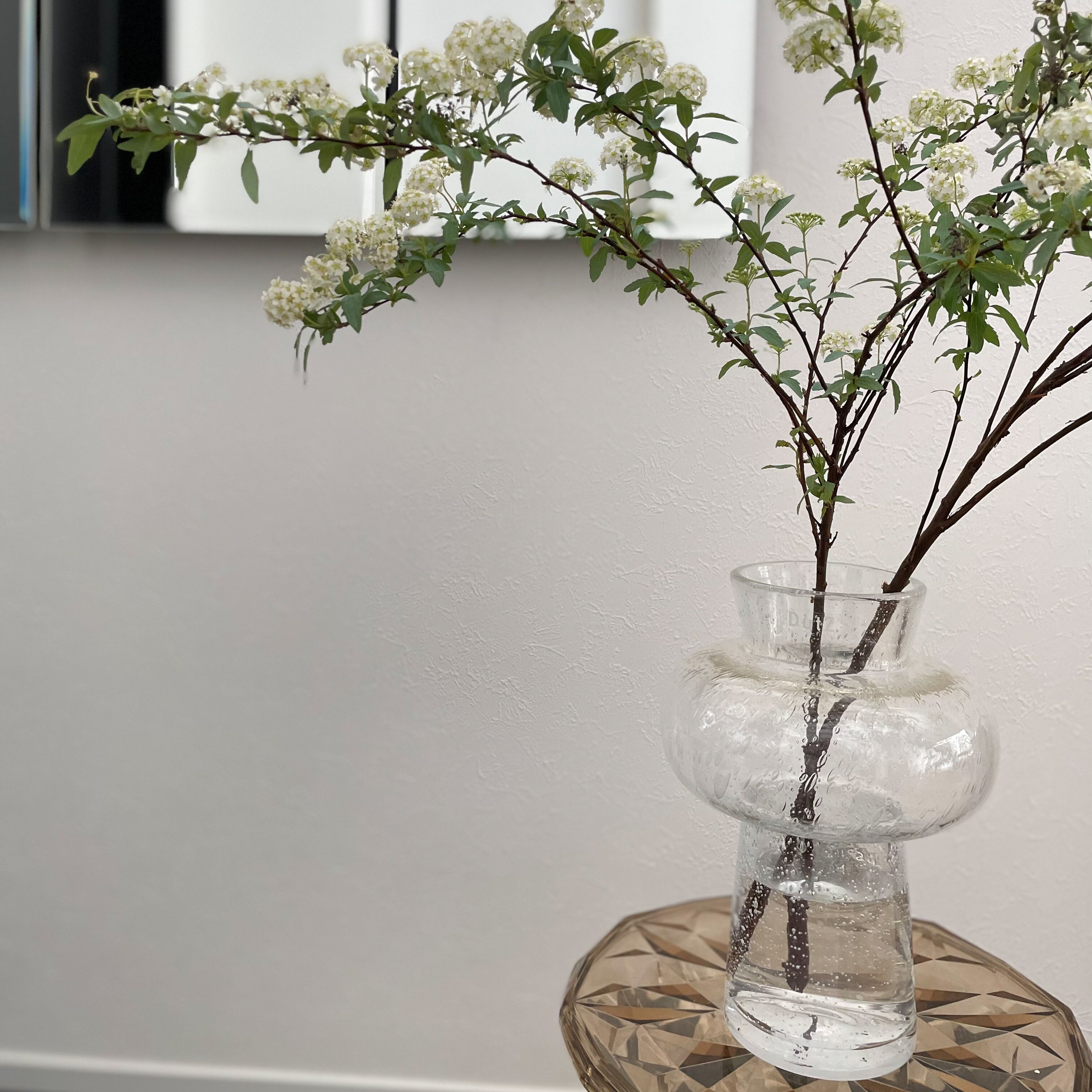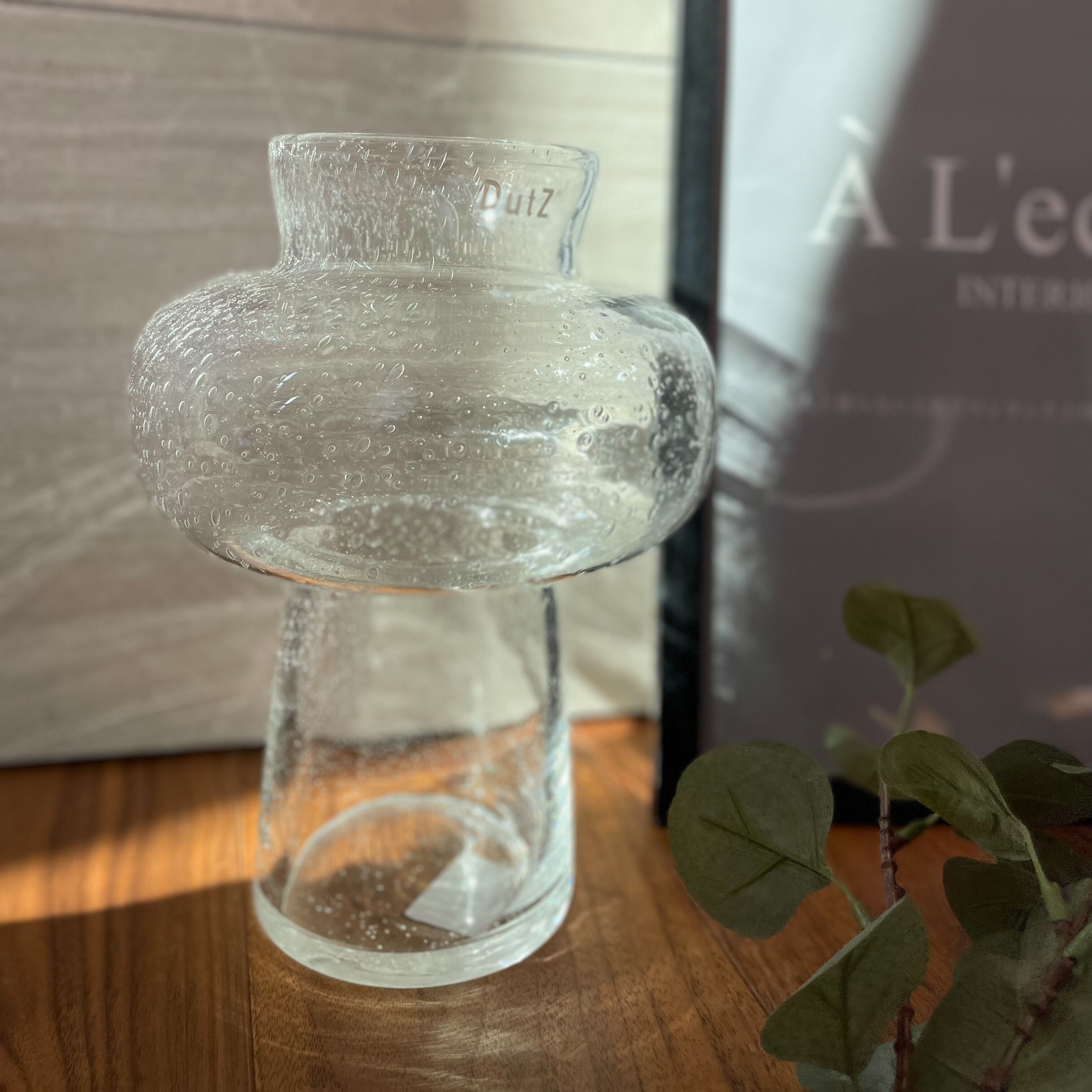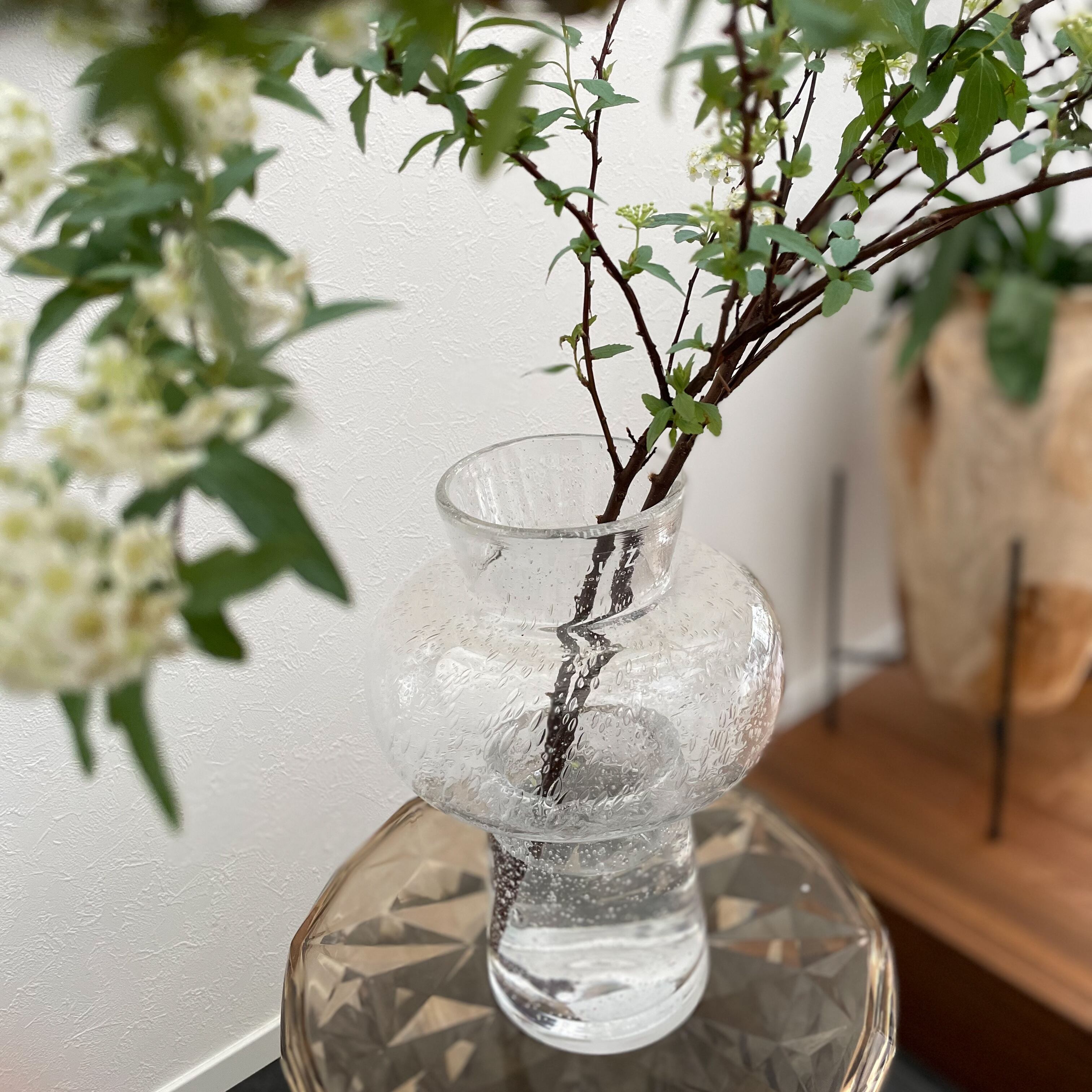 ガラスの気泡が美しく、シンプルながら目を惹く洗練されたデザインのフラワーベースです。
